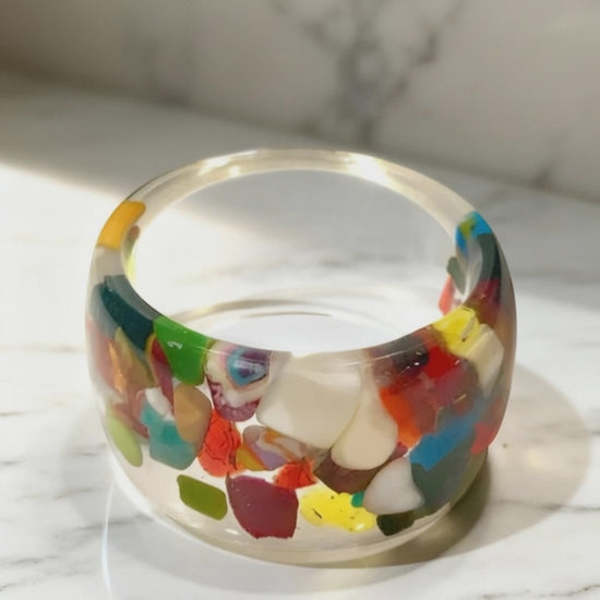 Our jewelry is considered wearable art, as each item is unique. Resin can be recycled and is therefore ecofriendly. Our designs are fresh and contemporary, incorporating color, happiness and attitude. All our jewelry is made under strict fair-trade conditions. To keep your jewelry in perfect condition, avoid knocking it against hard surfaces or exposing it to extreme heat. When treated with love, resin will last for years. To clean an restore your jewelry to its original brilliance, simply rub a small amount of moisturizing cream into a cloth and apply it gently to the piece.